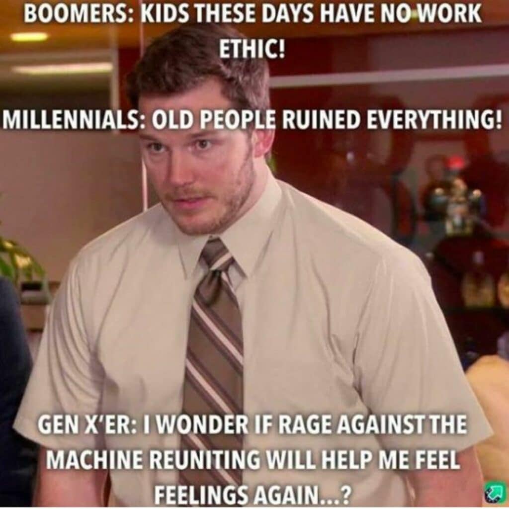 In this case, while Baby Boomers and Millennials fight, Gen X is, again, out of the fray and considering some deeper issues, mainly whether their favorite band reuniting will help renew their sense of vigor for life. If you’re a Gen X member who relates to this meme, we hope you find the peace of mind you’re looking for.